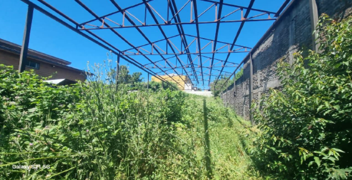 Estructura metálica en desuso que cubre prácticamente toda la superficie del terreno.